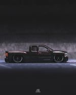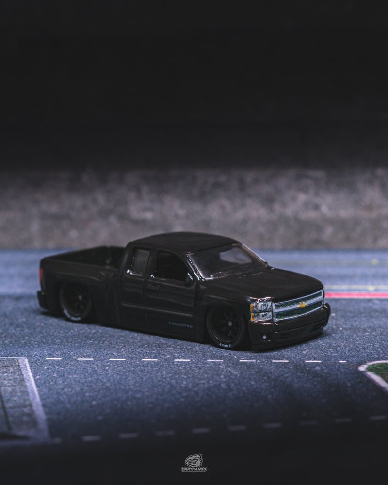 This Chevy Silverado was fully stripped and repainted in a deep gloss black, giving the truck a clean, intimidating presence that completely transforms its original look. The base has been shaved to achieve a proper lowered stance, eliminating excess gaps and bringing the body down exactly where it belongs.