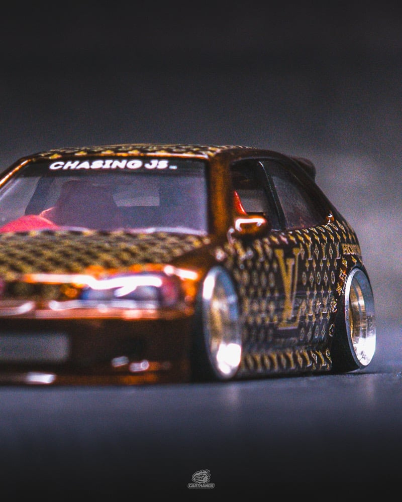 This one-of-one build features a full Spectraflame Root Beer repaint, giving the car a deep, luxurious glow from every angle. Wrapped in custom Louis Vuitton-inspired decals, the entire exterior carries a high-fashion aesthetic you won’t find anywhere else.