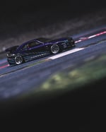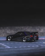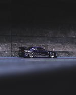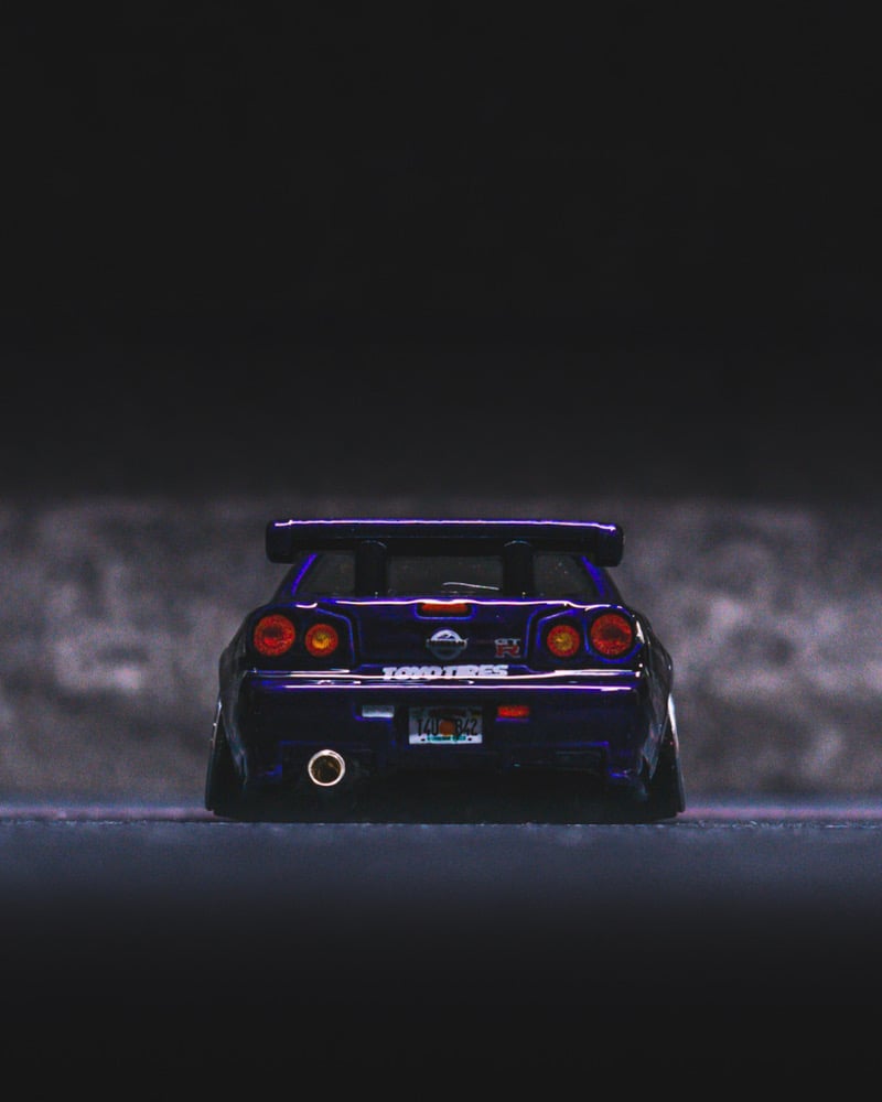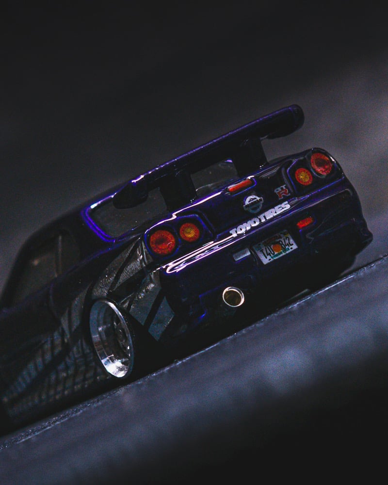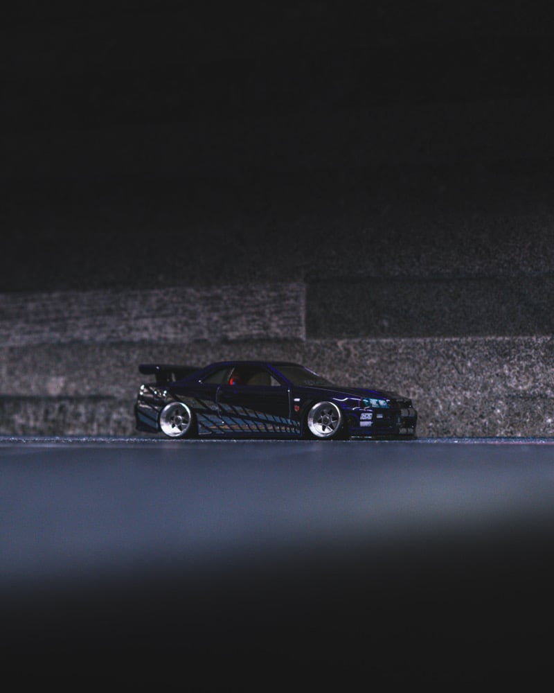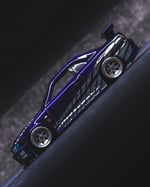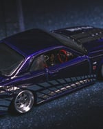 The original paint was fully stripped and the car was repainted in a deep dark purple, then finished with custom chrome “2 Fast 2 Furious” style Skyline decals for an aggressive, iconic look. The stance has been perfected with a shaved base and shaved fenders for a clean, planted profile.