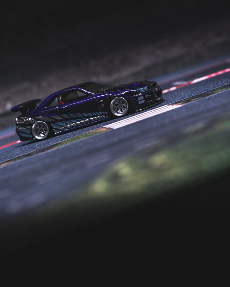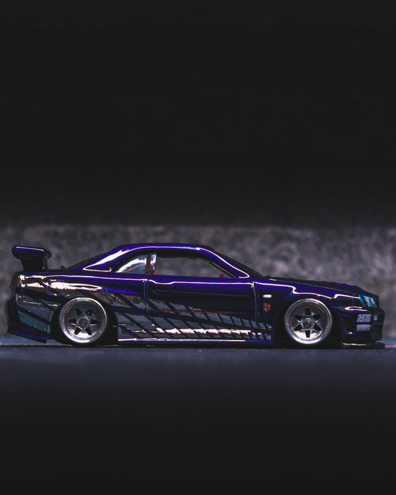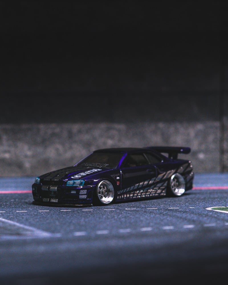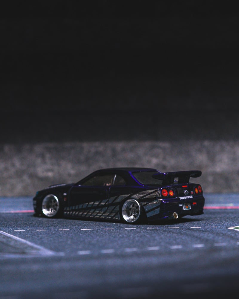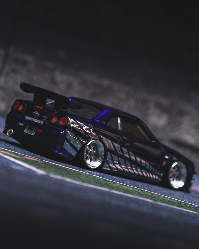 This Nissan Skyline GT-R R34 is a custom-built replica of the NFT Hot Wheels Nissan Carthangs Edition, reimagined as a high-end, fully detailed collector showpiece.